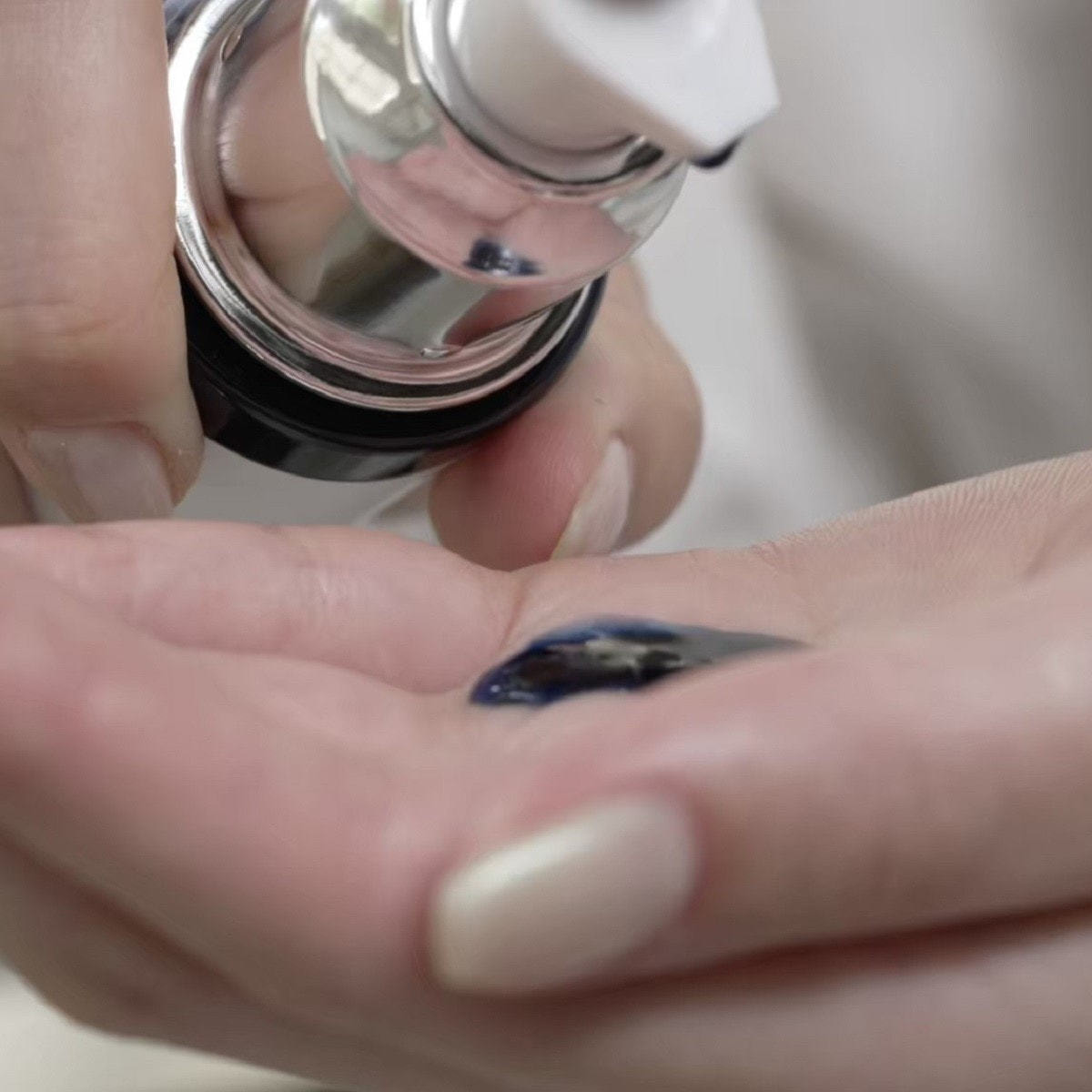 シクロペンタシロキサン、ジメチコン、エチルヘキサン酸セチル、水添ポリイソブテン、ジメチコノール,γードコサラクトン、イソステアロイル加水分解コラーゲンAMPD、イソステアロイル加水分解ケラチン(羊毛)、フラーレン、ミネラルオイル、アルガニアスピノ核油、ブドウ種子油、バオバブ種子油、イソノナン酸イソノニル、ラウリン酸ポリグリセリルー10、ホホバ種子油、アーモンド油、PVP、トリ(カプリル酸/カプリン酸)グリセリル、シクロヘキサンー1・4-ジカルボン酸ビスエトキシジグリコール、イソステアリン酸、トコフェロール、BG、水、クエン酸、クエン酸Na、香料、青403