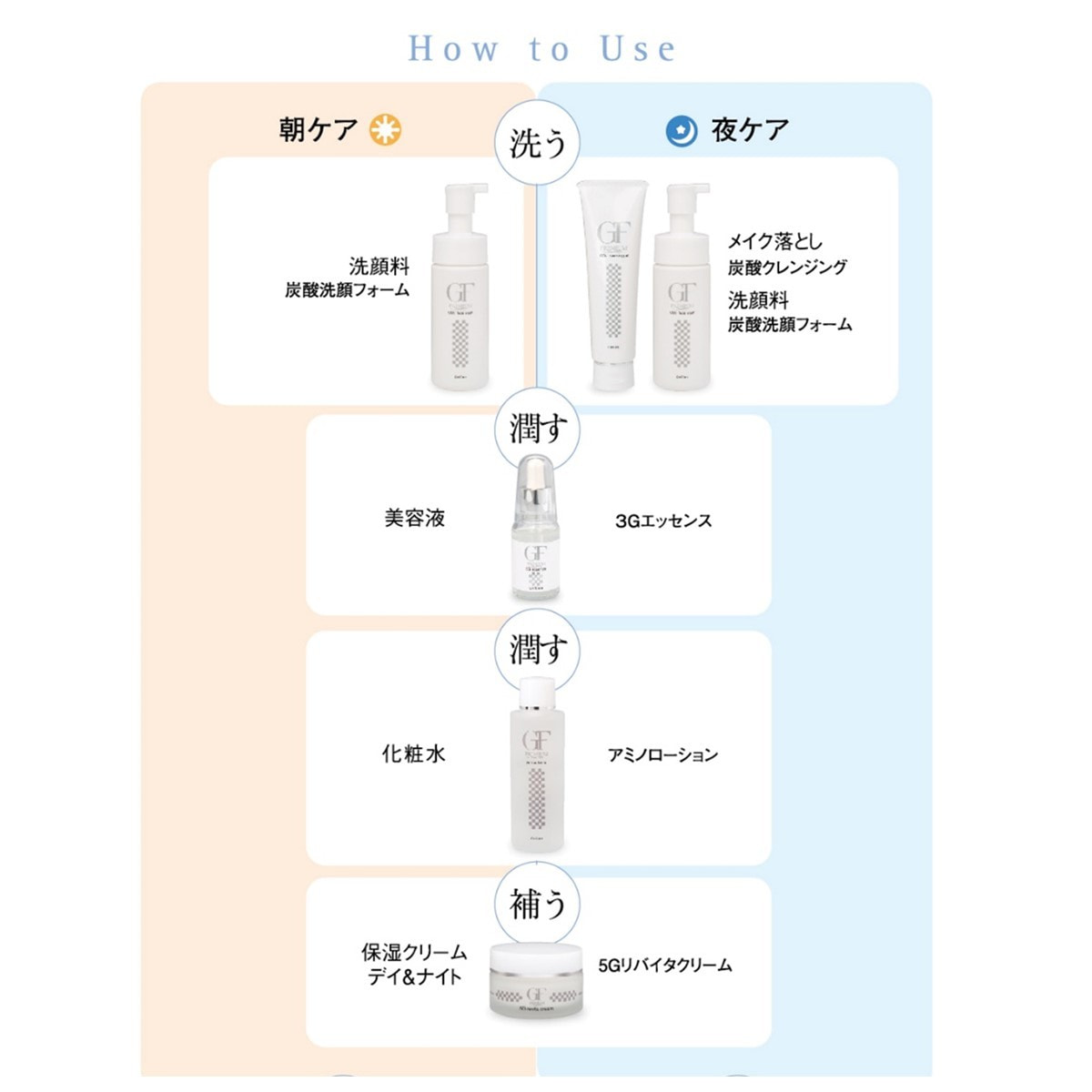 特に注目の5種類のGF「グロースファクター」成長因子「EGF・FDF・IGF・TGF・TRX」が新しい皮膚細胞の活性を促します。